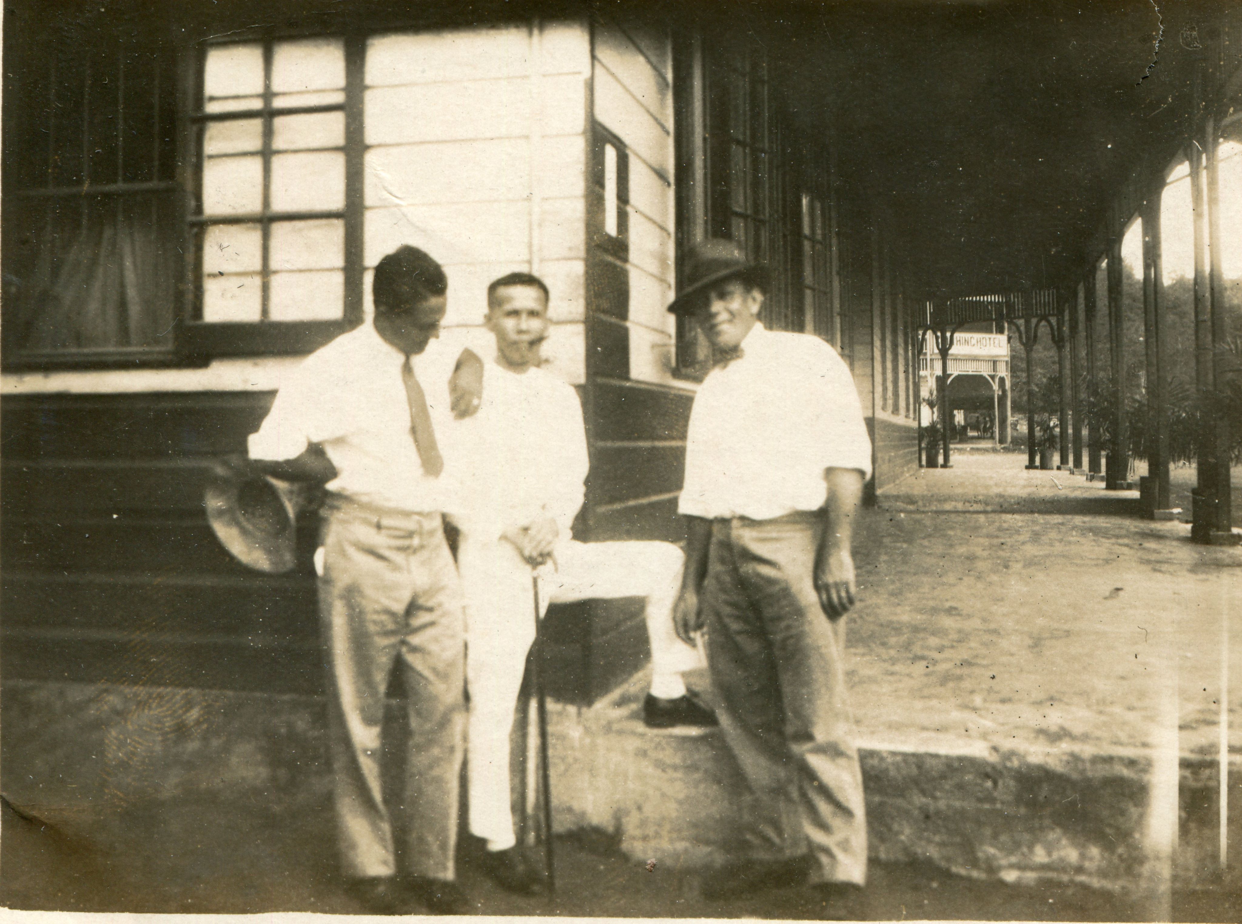 A rare photo of Ah Chee (centre) outside his hotel with two Australian friends who no doubt benefited from his famed generosity. Photo kindly supplied by Adam Peripatus Liu.