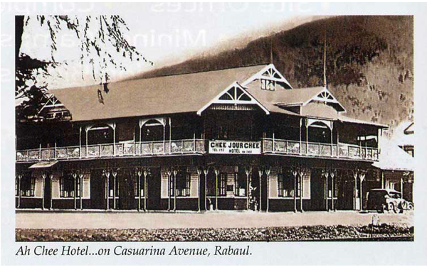 “‘Ah   Chee   kept   the   hotel   opposite   Ching  Hings  in  Rabaul,  on   the   corner   of  Chinatown.   Other   hostels   came   and  went.   The   new   post-war   Mandate   Administration   formed   three   clubs   and   a  “white”  pub   opened   its   doors,   but   “Ah  Chees’   survived.