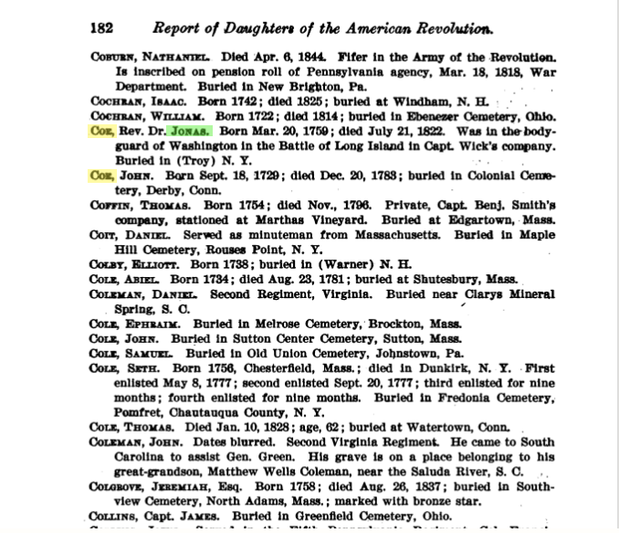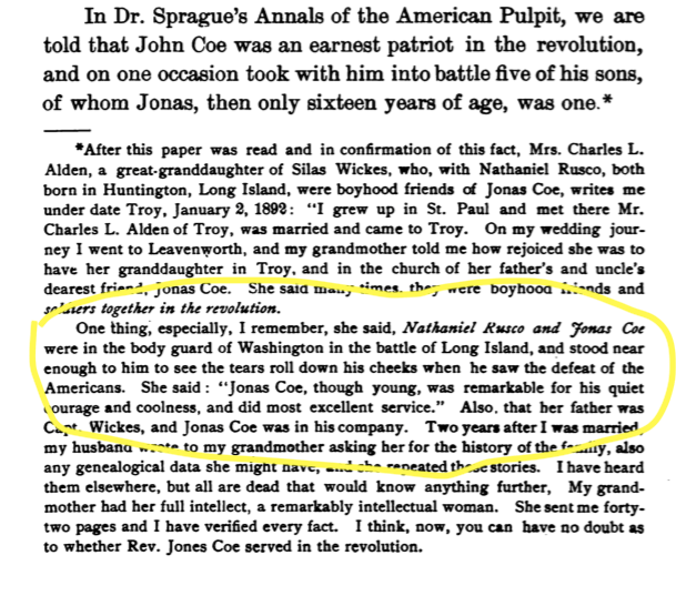 History books and documents also record that our ancestor Jonas Coe “was a body guard for Washington in the Battle of Long Island and was close enough to see the tears roll down his cheeks when he saw the defeat of the Americans.”
