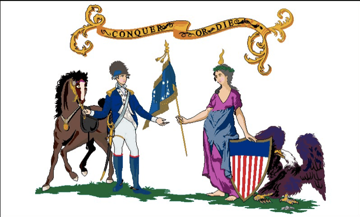 The corps’ flag (pictured above, right) was white silk on which the following was neatly painted: A guardsman is holding the Life Guard’s banner and is in the act of receiving a flag from the ‘Genius of Liberty’ who is personified as a woman leaning upon the Union Shield. She stands alongside the American Eagle and above is the motto of the corps, ‘Conquer or Die,’ written upon a ribbon.
