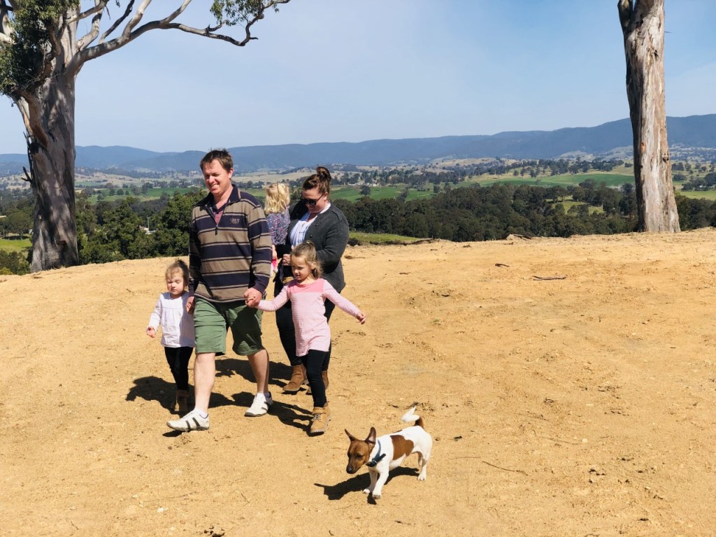 That’s what had happened to the recipient family we filmed – Angus and Stephanie Johnston and their three little girls aged two, four and six, pictured above After losing everything, they’d lived firstly in a garage and then a small rental before Mick delivered their temporary home on wheels to their block in the Bemboka hills.