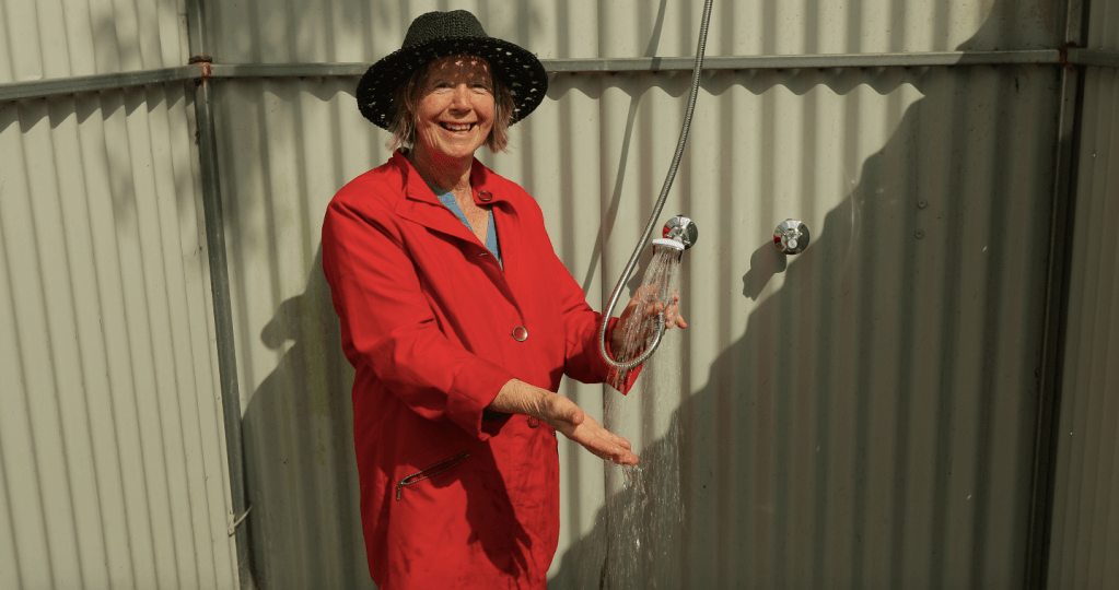 Mick and his mate Mark Smith from the Social Justice Advocates fixed that. They installed a pump from Jan’s creek, a hot water system and a shed with shower. The look on Jan’s face said it all as the water sprang from the shower nozzle – for the first time on her property in two years.
