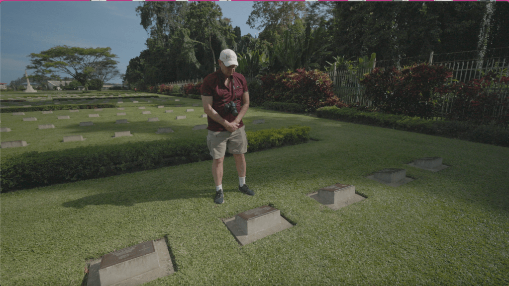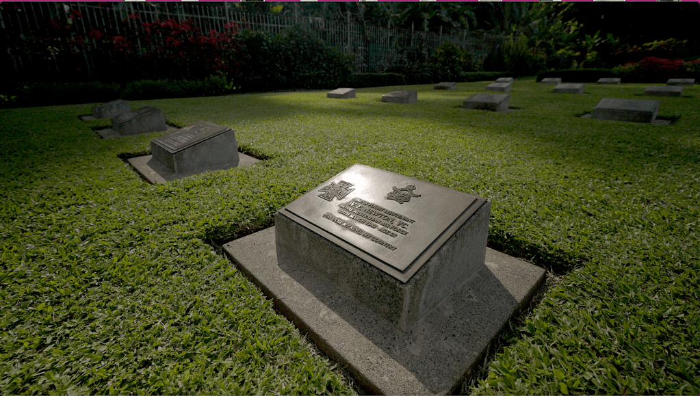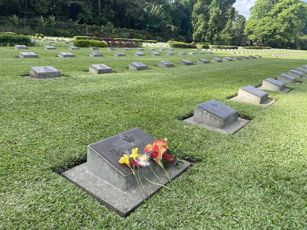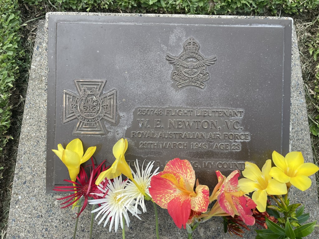 As I picked some tropical flowers at the cemetery to lay on Newton’s gravestone, I thought of course of his family and descendants, some of whom I’ve been lucky to meet over the years. One is the airmen’s nephew Nick Newton who grew up hearing stories about him from his father, Bill’s brother Lindsay. Nick’s eldest son, William Ellis Newton, is named in his honour. Another descendant is Adam Joseph who has long campaigned for the story of Bill Newton VC to be more widely known. A treasured family photograph is displayed above. It’s a studio portrait of the three brothers, Lindsay Newton, a dentist in the Australian Army Medical Corps, Surgeon Lieutenant John Newton, Royal Australian Navy, and Flight Lieutenant William (Bill) Newton, Royal Australian Air Force. The photograph was a spontaneous idea after the three brothers met by chance at the Hotel Australia in Melbourne. It would be the last time they were all together.