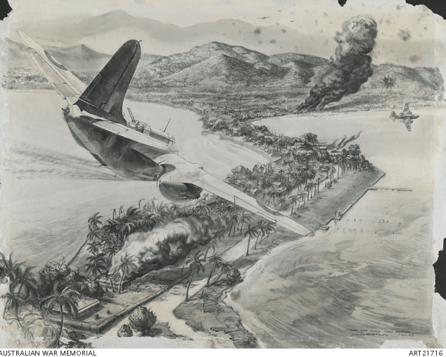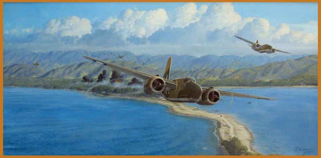 Two days before he was shot down, Bill had nursed his crippled bomber 180 miles back to Port Moresby where ground staff counted 98 bullet holes in the aircraft. Undaunted, he returned within 48 hours in a different aircraft.As he bombed his designated target, Newton’s Boston was hit by flak and burst into flames.
