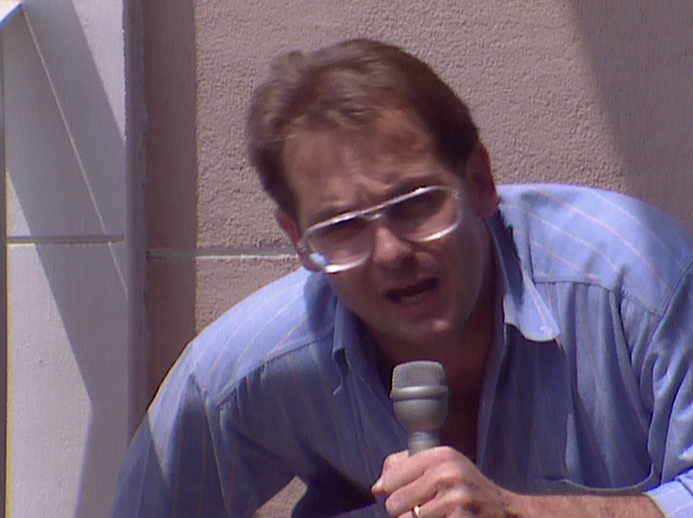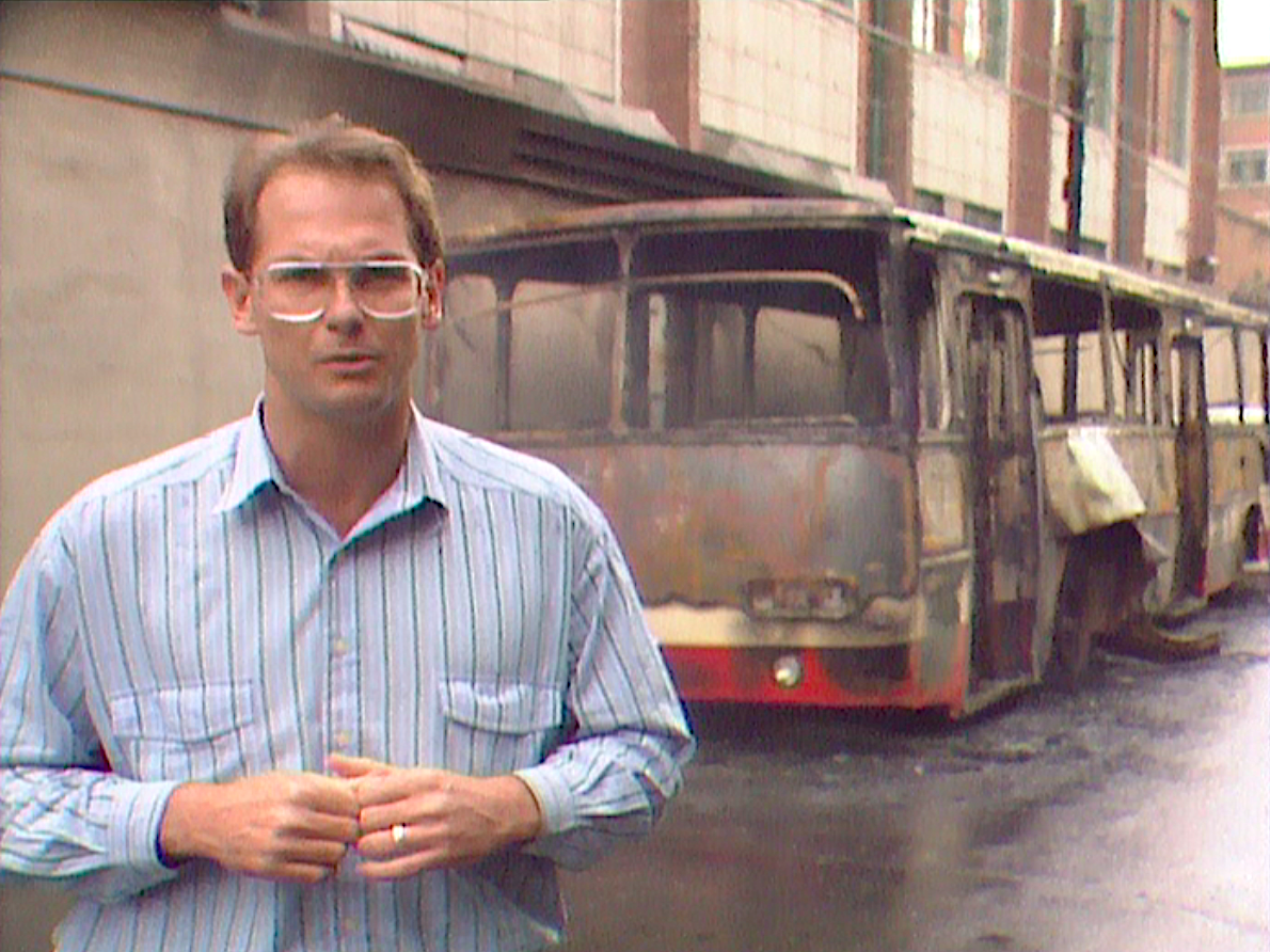 ABC Radio’s award winning correspondent Peter Cave captures gunfire on his microphone as Max Uechtritz records a piece to camera filmed by Willie Phua. The streets of Beijing in June 1989