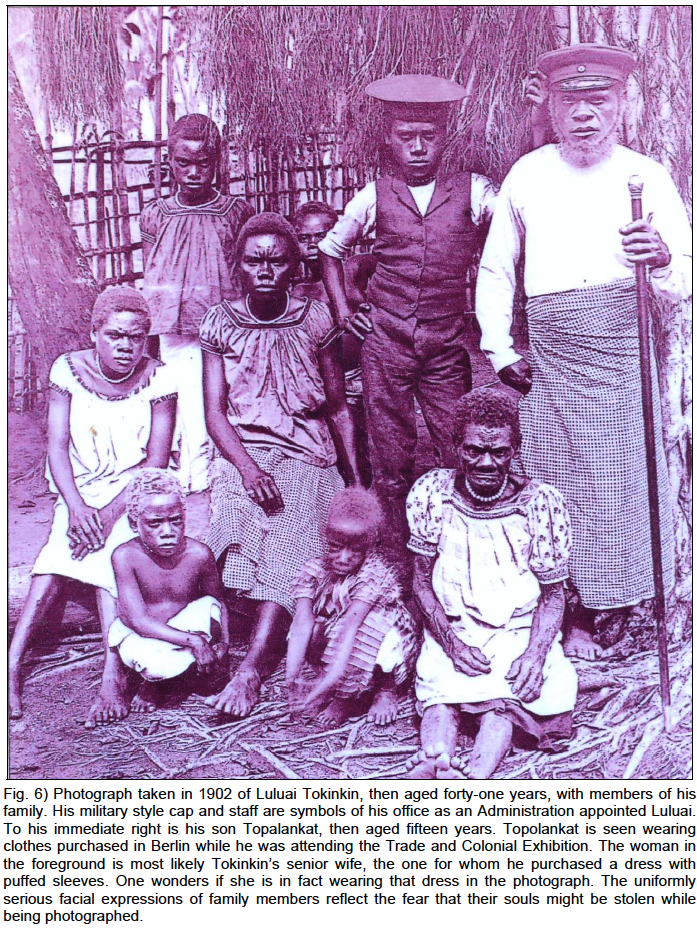 The signature photograph at top of this blog is from my collection and was taken by Richard Parkinson in 1902. It shows ToKinkin, now 41 years old, with members of his family. His military style cap and staff are symbols of his office as an administration-appointed Luluai. Next to him is his son ToPalankat then aged 15. He is wearing clothing he bought in Berlin. The woman in the foreground would presumably be his senior wife, the one for whom ToKinkin bought the blue satin dress with puffed sleeves in Berlin, Perhaps that is the very dress she is wearing in the photograph.