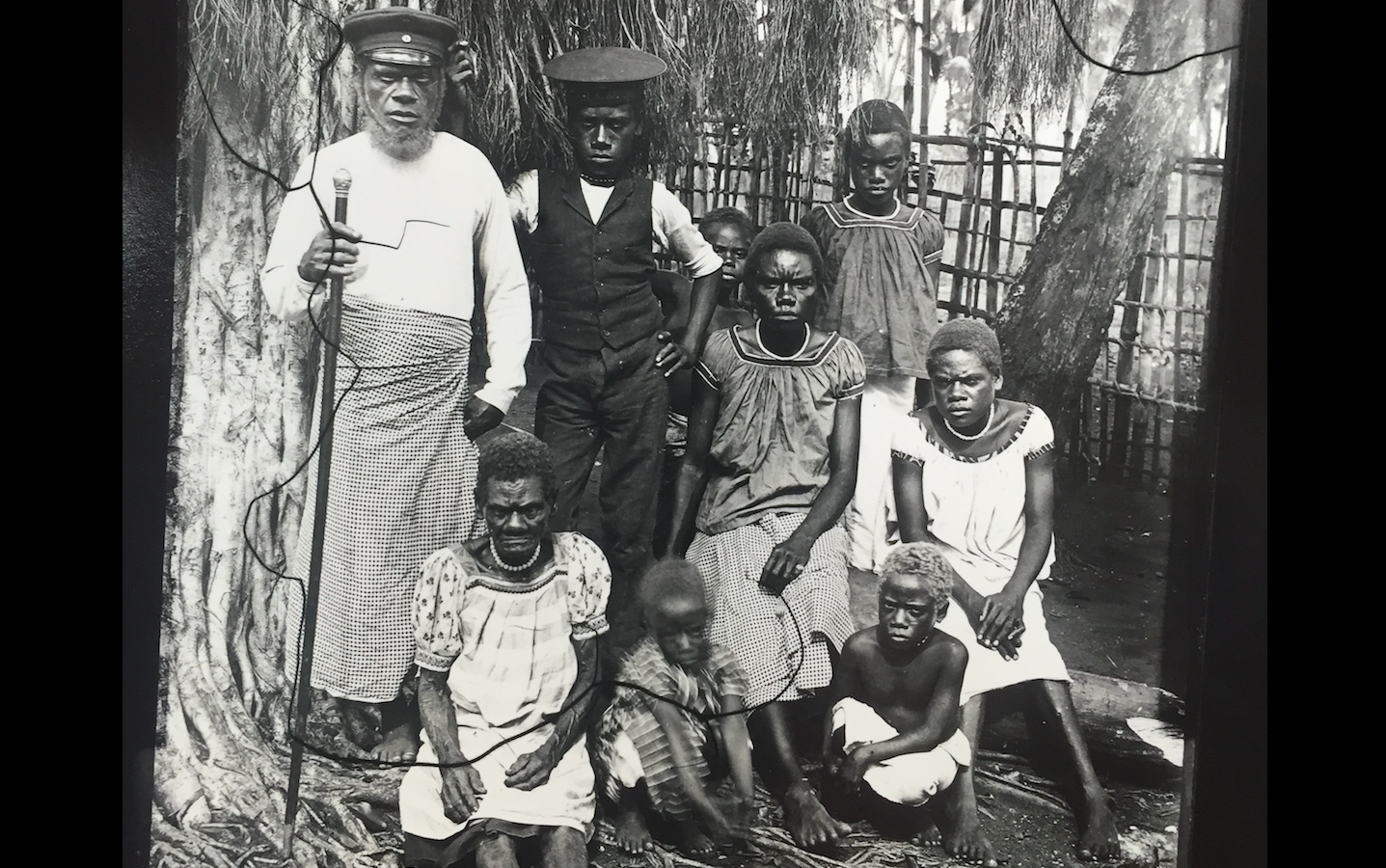 The above photo of the pair – who also carried the titles of King and Queen of Prussia – shows them posing in front to the New Guinea exhibition with other distinguished guests on opening day. A Tolai fish trap can be seen in the background.