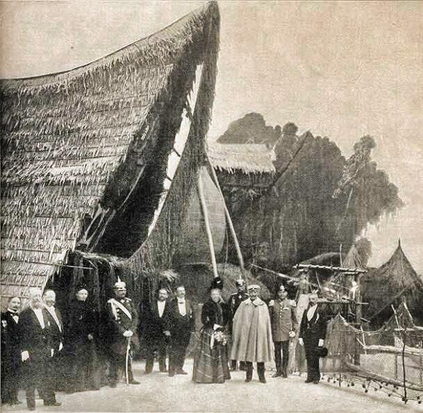 The Expo was something of a propaganda exercise for the thrusting German empire. The colonial section also included exhibits and people from German East Africa colonies. The New Guinea section included a Haus Tambaran “genuine down to the last spar” and next to it “a tabu house on stilts” from *Seleo Island (in today’s Sandaun Province).
