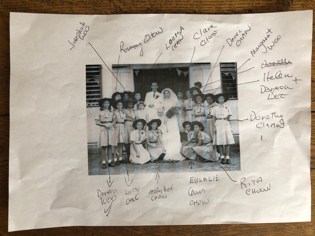 It would have been lovely for her to meet Eulalie and Helen. It’s a nice thought, however, that she’ll have joined in heaven others in the photo including the guides head girl, the late Philomena (Ning) Seeto, picturing standing next to my father in the photo.